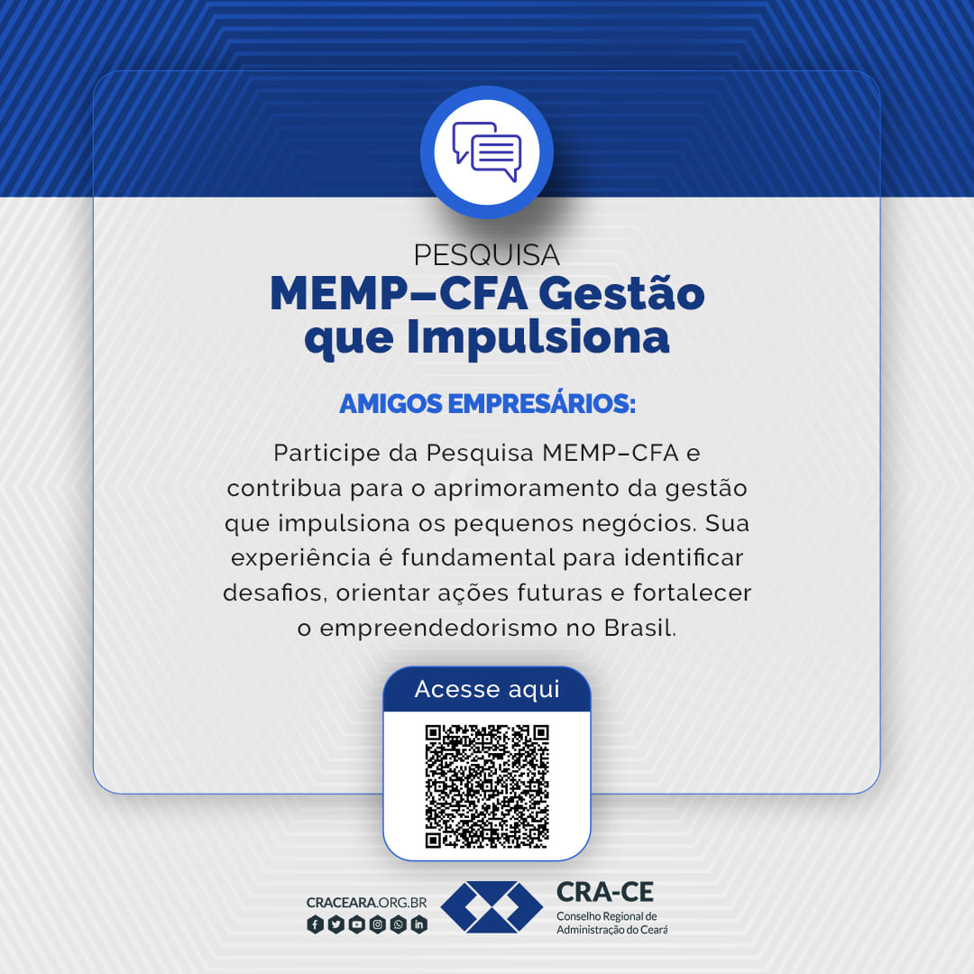 A Pesquisa MEMP x CFA, realizada pelo Ministério do Empreendedorismo - MEMP em parceria com o Conselho Federal de Administração (CFA), tem como objetivo ouvir os empresários protagonistas para identificar, de forma simples e direta, os principais desafios da gestão dos seus negócios.